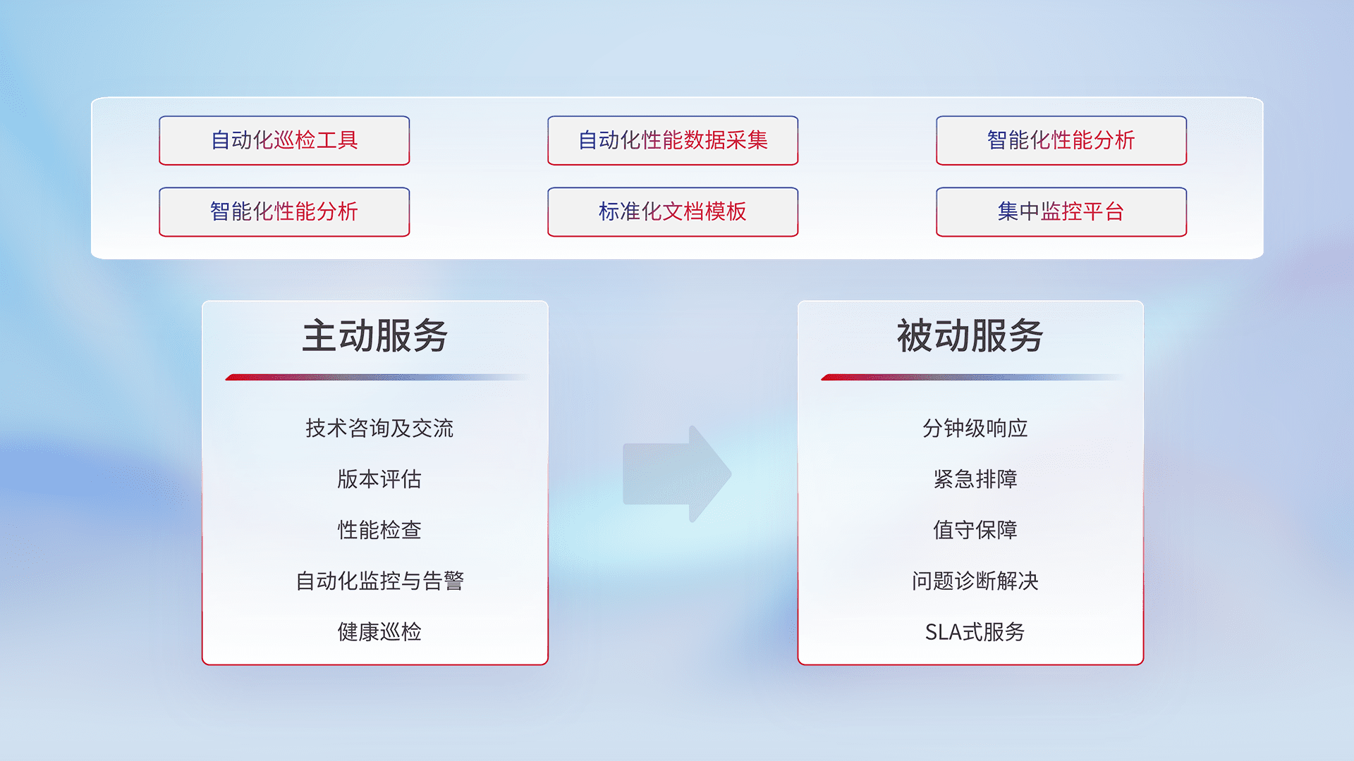智能化工具和标准化文档,,,保障服务质量,,,提供主动服务(包含技术咨询、、、、版本评估、、、性能检查、、、自动化监控与告警、、健康巡检)和被动服务包含(分钟级响应、、、紧急排障、、、、值守保障、、、问题诊断解决、、SLA服务)。。。。